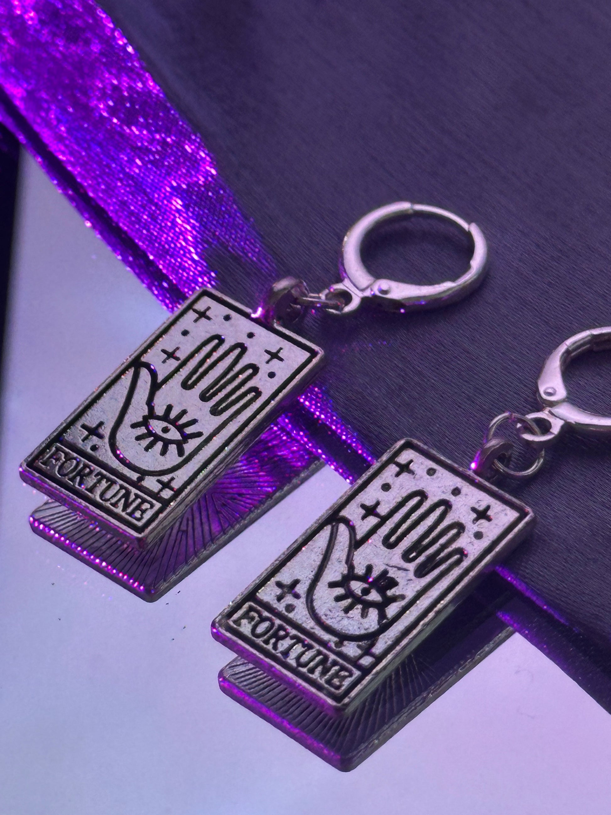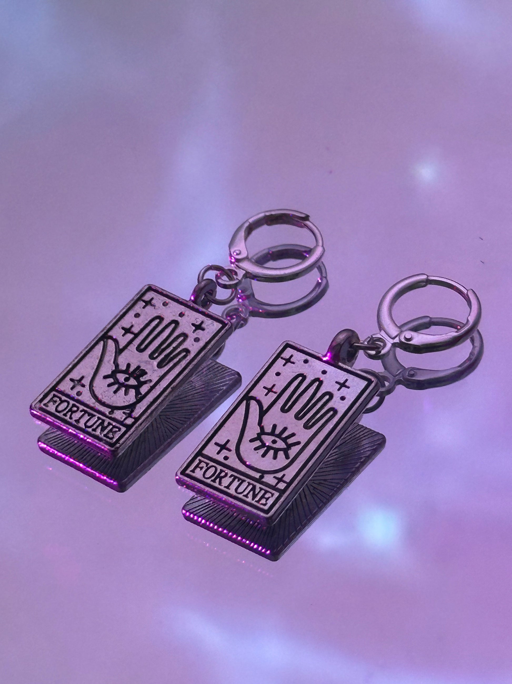 These are silver filled huggie hoops with stainless steel tarot card charms.Â